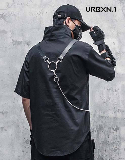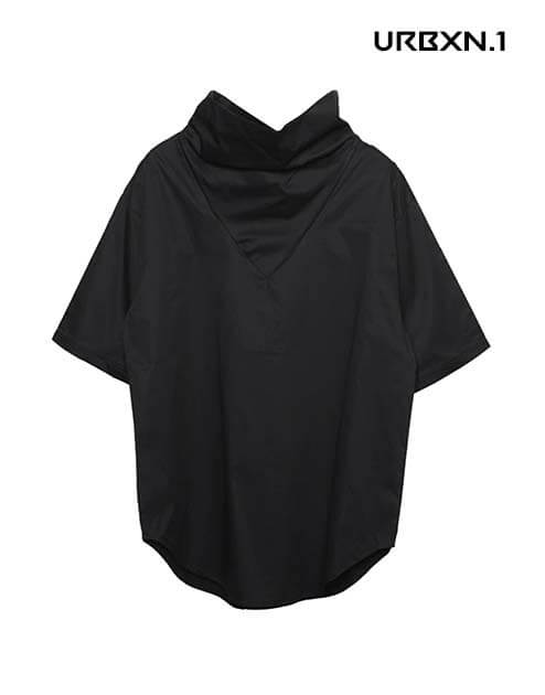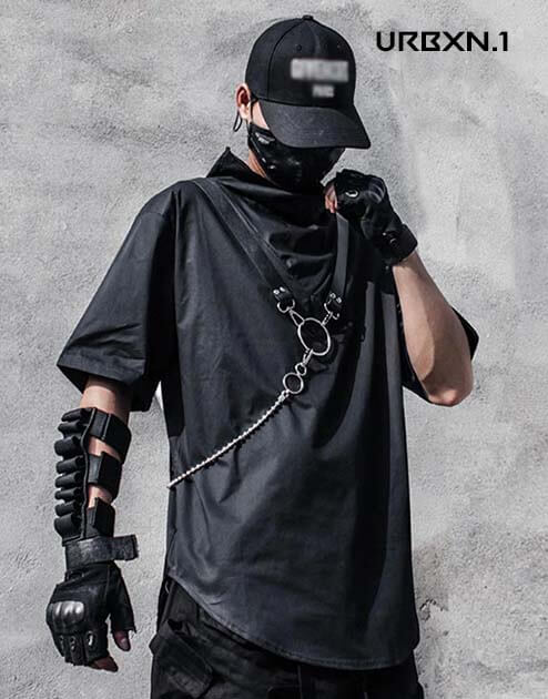 Zaprojektowany w szczególnym kroju, czarny, oversizowy top z odzieży technicznej ma dłuższą długość niż klasyczne t-shirty. Posiada również golf, który zapewnia styl i wygodę. Rękawy są półkrótkie, a wyglądem przypominają skórę. Krótko mówiąc, uniwersalna i futurystyczna koszulka z motywem miejskiego ninja, którą można nosić latem.