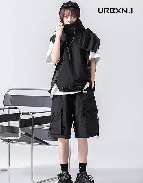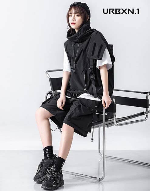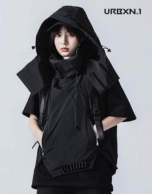 Niezwykle praktyczna w życiu codziennym, techwearowa bluza z kapturem w formie małego bezrękawnika ma również miejski design, który jest bardzo popularny wśród fanów ruchu techwear. Całkowicie czarna, ta odzież taktyczna wnosi ciemny styl streetwearowy, aby dyskretnie wtopić się w otoczenie.