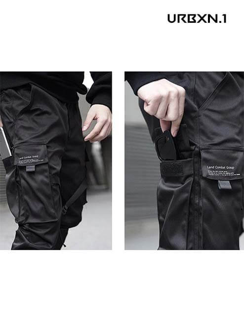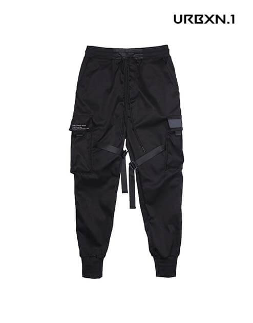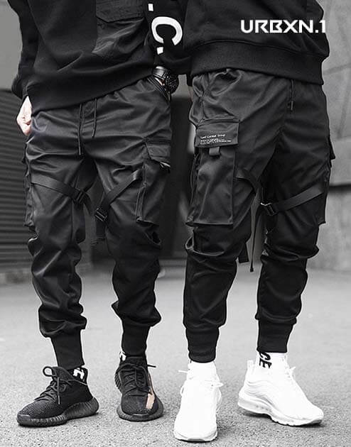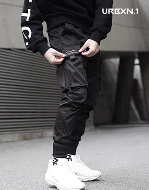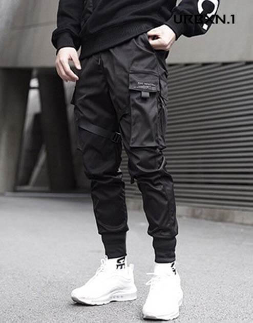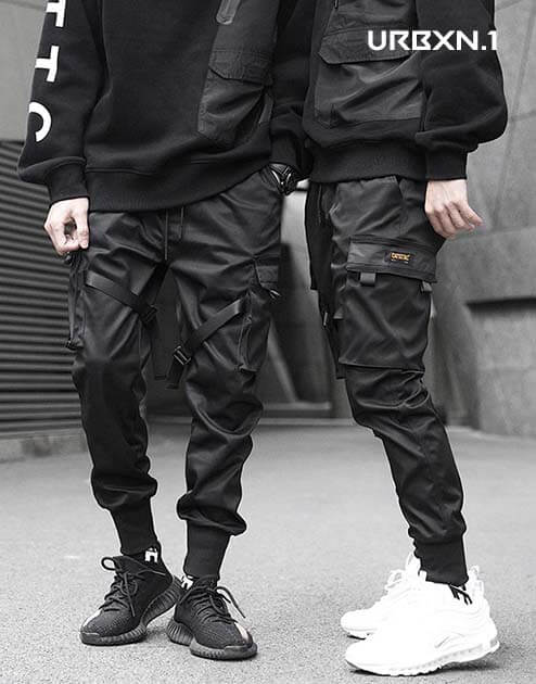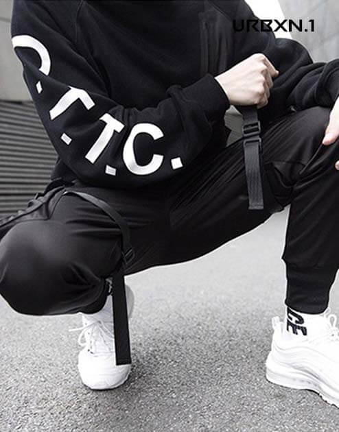 Odkryj te czarne spodnie do biegania w stylu techwear, inspirowane modą na odzież sportową i futurystyczną techwear. Połączenie innowacji w zakresie tekstyliów i estetyki spodni. Spodnie są przede wszystkim wygodne i funkcjonalne, mają luźny krój, ale są ściągane w kostkach. Są one ściągane w talii nie za pomocą paska, lecz sznurka, jak w przypadku sportowego stroju do biegania.