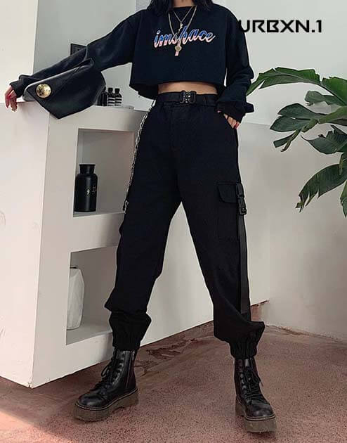 Inspirowane odzieżą wojskową i ruchem warcore, te czarne spodnie dla kobiet mają duży regulowany pasek. Podobają nam się również praktyczne rozwiązania w postaci dużych kieszeni po bokach na wysokości dłoni. Na wysokości kostki spodnie o kroju cargo są ściągnięte, aby można je było łatwo wsunąć do wysokich butów.